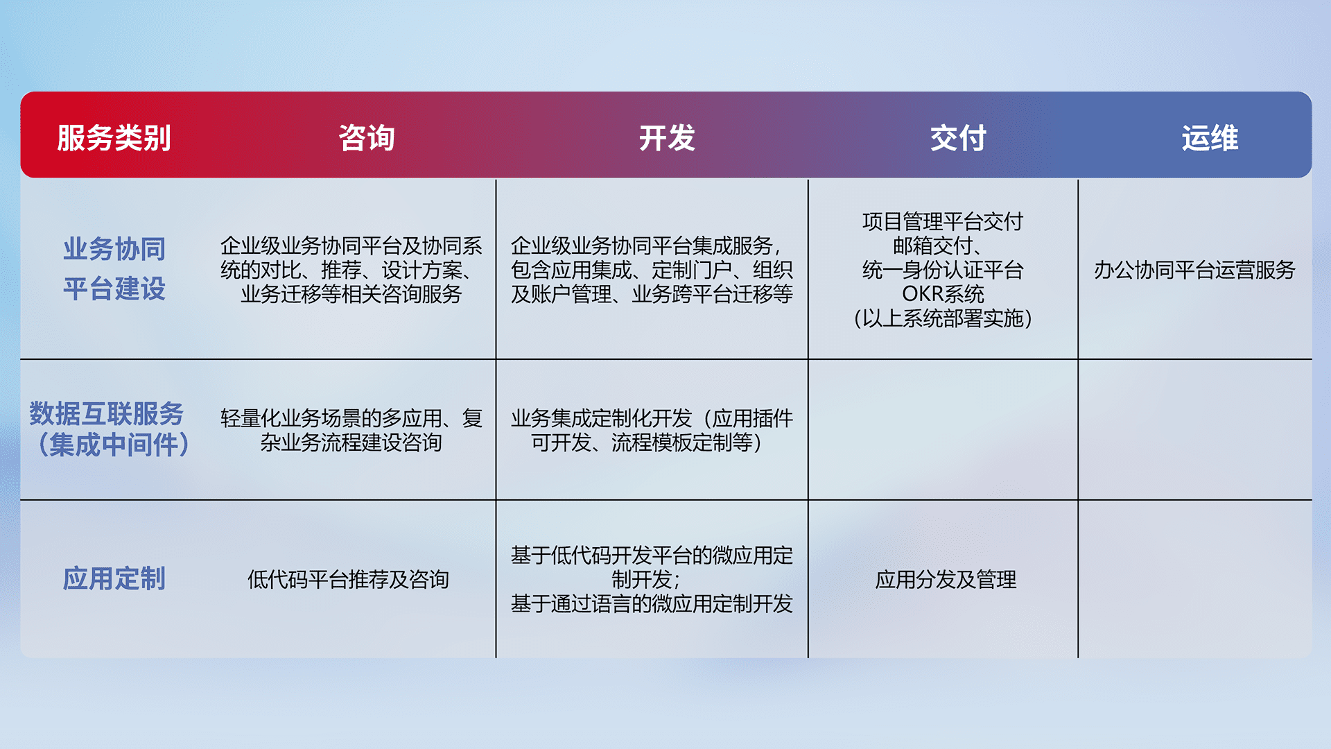针对钉钉、、、、企微、、IDaas等平台级产品提供产品的规划、、、、方案、、、、交付、、定制化开发等服务,,,,实现如统一协同办公、、、智能客户服务、、混合会议管理、、、智能数据查询、、、、等业务场景,,,实现数字化转型。。